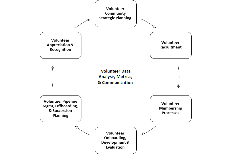 We have found that the essential elements to the lifelong engagement model include: strategic planning, volunteer recruitment, onboarding/professional development/evaluation, pipeline management and succession planning, and volunteer appreciation & recognition—all grounded in strong data analysis/metrics and communication (see below).
